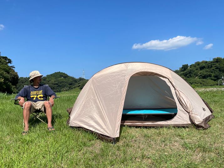 設営完了した状態がこちら。同じく2人用であるモンベル「ムーンライト テント2」よりやや小さめのサイズです。最近のキャンプシーンで流行りのナチュラルカラーのため、ウッディなギアや鋳鉄系のアイテムとも相性がよさそうです。