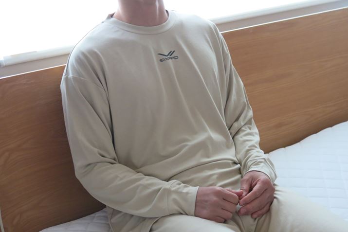 「シックスパッド リカバリーウェア スリープ」は、通常版の「シックスパッド リカバリーウェア」と比較すると、生地がやや薄手(しっとりとした滑らかな着心地は変わらない)。その分、着心地は軽やかだ。ゆったりとした締めつけのないシルエットで、着ていてとてもリラックスできる。そのため、一日の仕事を終え、入浴後に「シックスパッド リカバリーウェア スリープ」に着替えると、体が睡眠へと向かうスイッチが入るような感覚が得られる。寝返りもスムーズに行えているはずだ。