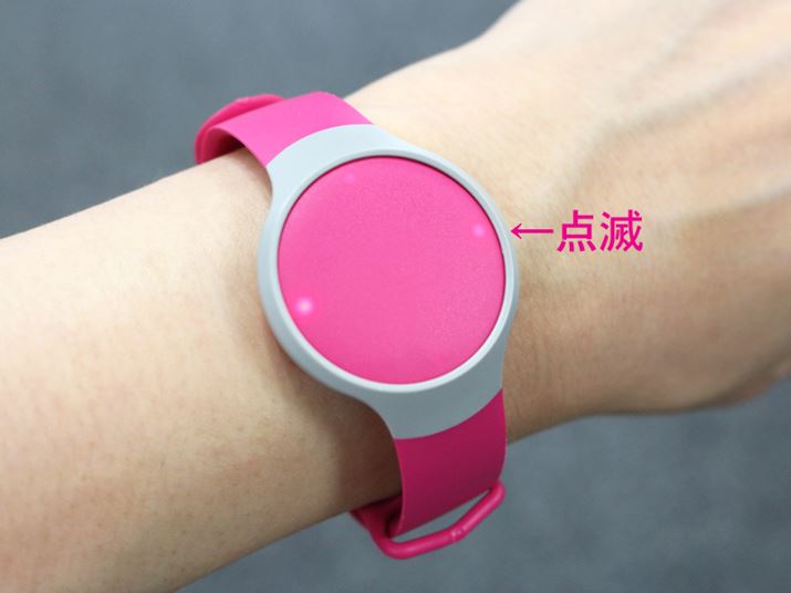 本体の中央を押すと、LEDライトが点灯して「活動量の達成率」、つづいて「おおまかな現在時刻」を表示する