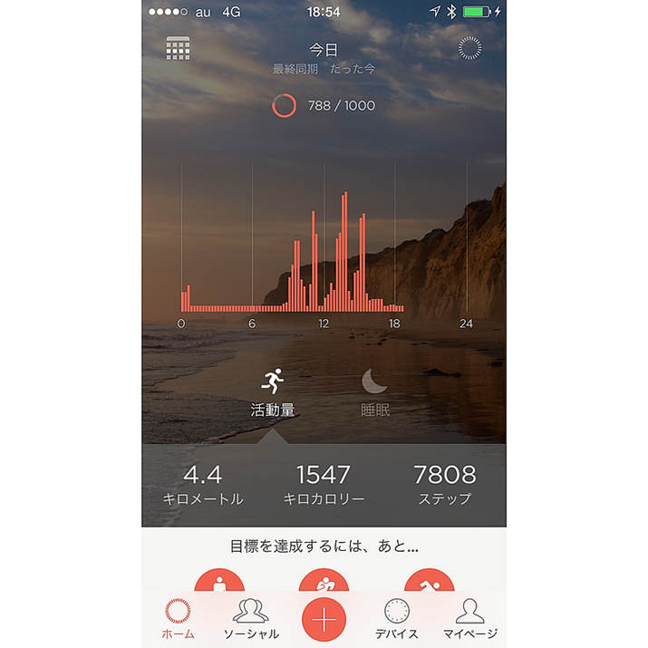 FLASHで取れるログは、「歩数・消費カロリー・移動距離・睡眠の記録」のみ。高価格帯の製品に搭載されている「食事内容の管理」や、「眠りが浅い時間を狙っての起床アラーム機能」などは備えていないが、「あまり多くの機能は使いこなす自信がない」という筆者のようなライフログビギナーには必要十分だ。シンプルとはいえ、活動量や睡眠時間の目標値を設定することは可能。設定した目標達成率は本体を押すだけで簡単に確認できるようになっており、達成率に合わせて運動量を調節するなど、健康管理のモチベーションが保ちやすい。