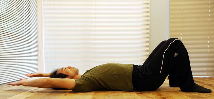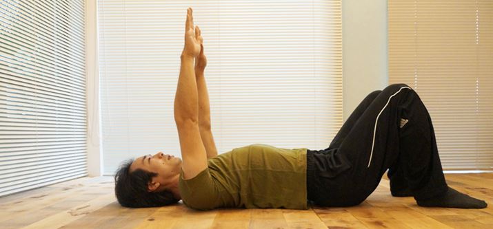 1:横になった状態で両膝を曲げ、両手を頭の上に向かってのばす。背中を床から浮かすように、腰骨と肩甲骨で身体を支える状態をキープする