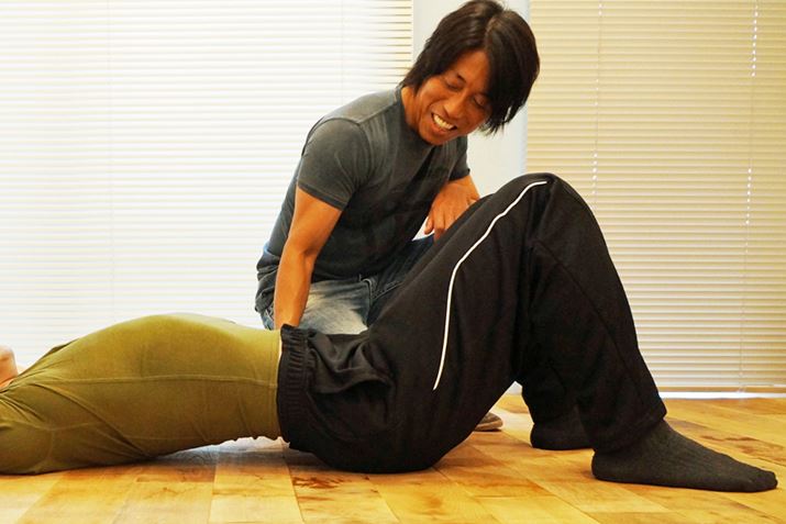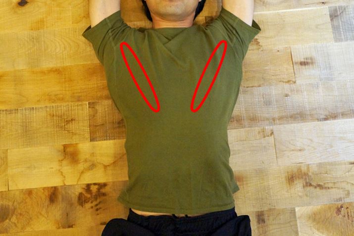 「一番重要なのは、背中全体をべったり床につけないこと。肩甲骨を寄せるようにして、その骨と腰の骨(骨盤)で体を支えるようにしましょう。背中の下に手が入れられるくらいの隙間をつねに空けるようにしてください。この姿勢をキープして手を上下に動かすことで、小胸筋を鍛えやすくなります。また、この体勢をキープすることで、姿勢がよくなる効果も得られます」