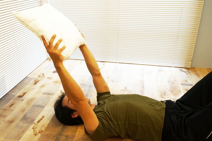 両腕を上下に動かすだけでは物足りなくなってきたら、まくらなどを手に持って同じ動きをすると負荷が増す。手に持つのはまくらでもいいし、本などでもOK。手近にあるものを活用しよう。