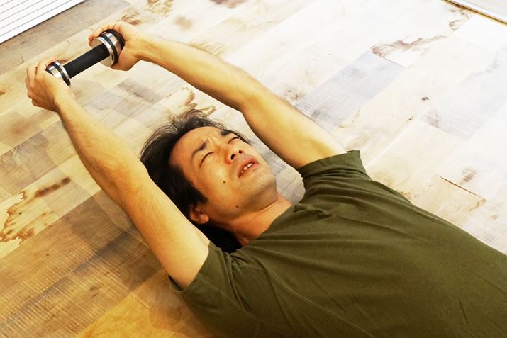 使用したのは5kgのダンベル。しかし、相当キツイ。特に、腕を下ろす際に床に着かないようにするのは、けっこう本気の筋トレレベル!