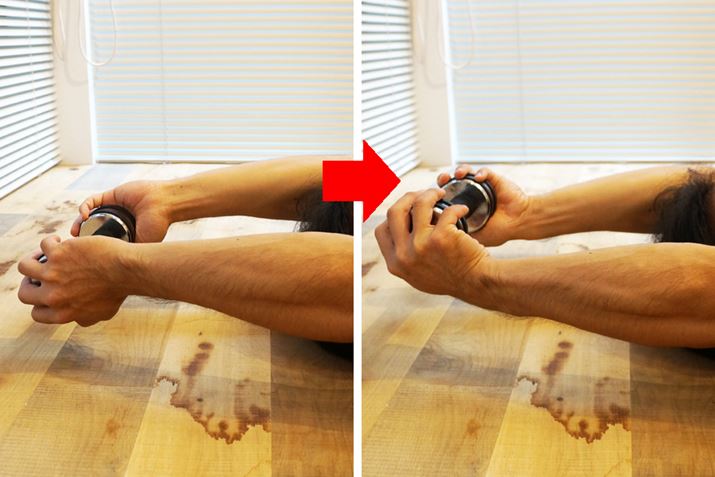 ダンベルの持ち方を、ちょっと変えるだけでより筋肉に負荷がかけられる。腕を下ろした際に手首を上方に返すようにすると小胸筋が引き伸ばされ、トレーニング効果が増す