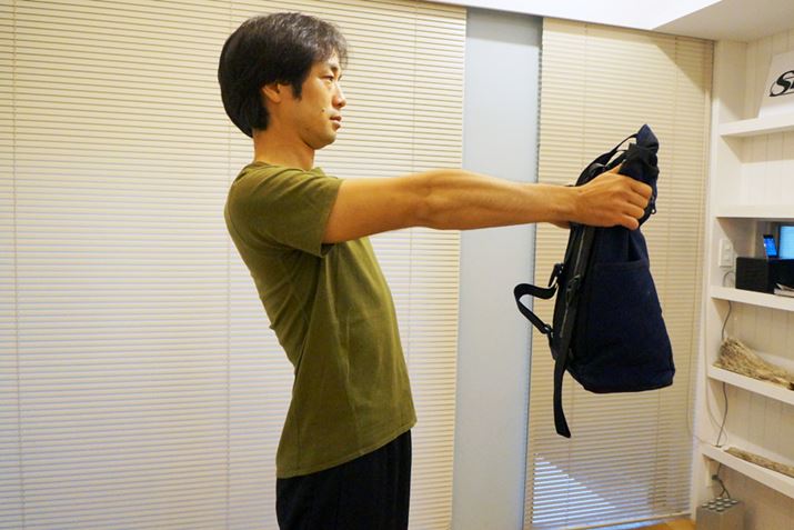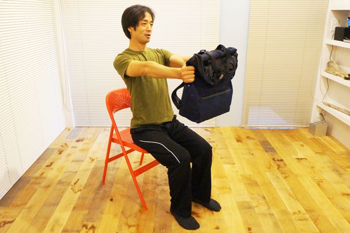 立った姿勢でカバンを持ち、腕を胸の位置まで上げてキープするだけでOK。この動作を10回程度行える重さになるように、カバンの中の物を調整しよう。