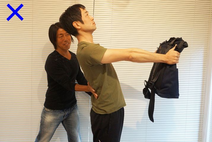 「多くのエクササイズに共通することですが、足はまっすぐ前に向けて平行に。手に持つバッグが重いとついつい背中が反ってしまいがちですが、背中を伸ばし、顔は正面に向けた姿勢を保ちましょう。姿勢を保つことで広背筋と脊柱起立筋をバランスよく鍛えられるだけでなく、その際に腹筋側も刺激されます。無理して重いものを持つよりも、姿勢を崩さないことが重要。また、このトレーニングはイスに座った状態でも行えます。その際も、背中はまっすぐにして、背もたれなどには寄りかからないようにしましょう」