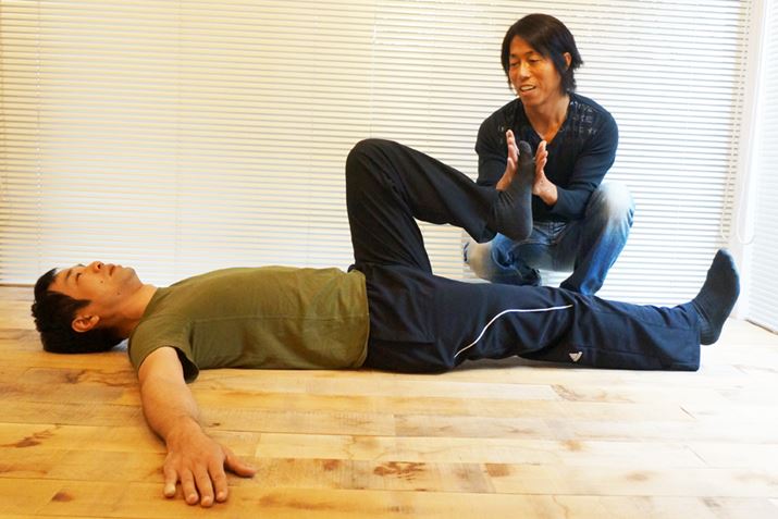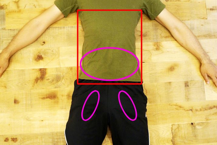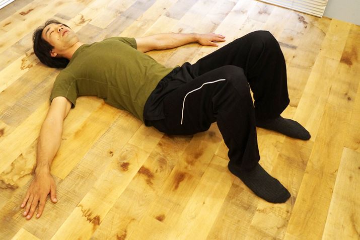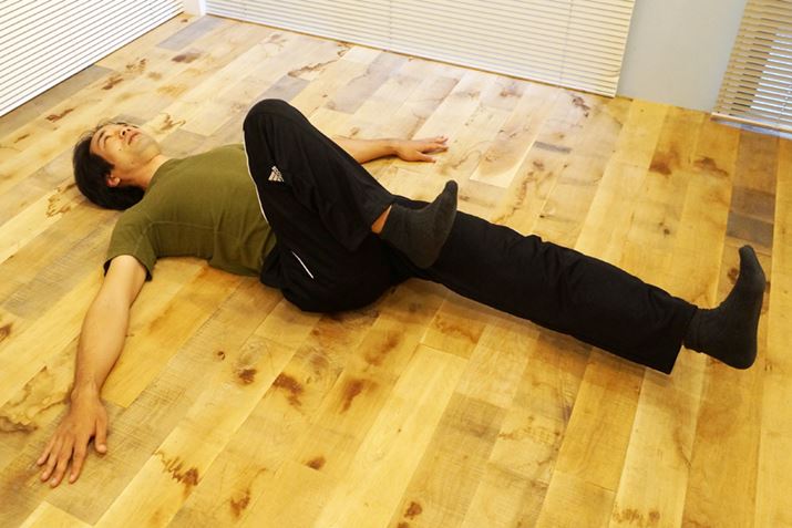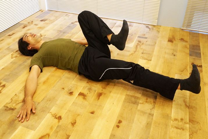 1:仰向けの姿勢になり、両手を広げて上体を安定させる