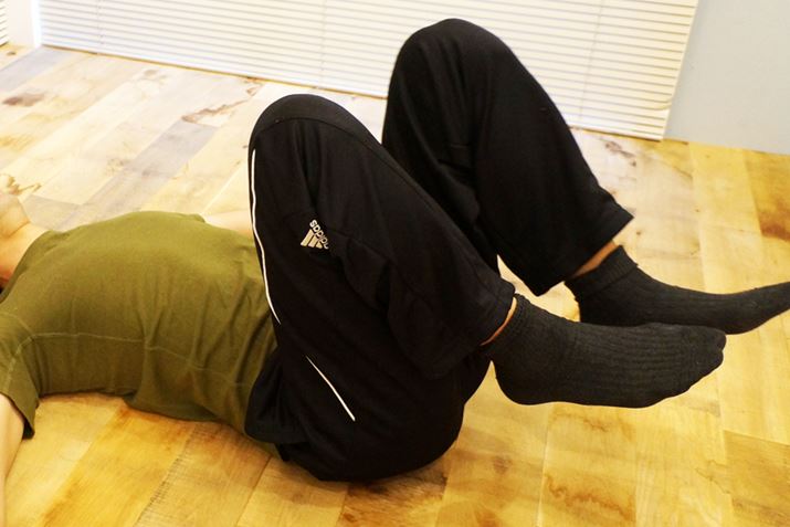 足の動作は、速いスピードで行わないように。動画のように、ゆっくりと自転車を漕ぐように動かそう。