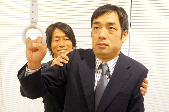 「野球のバッティングで小指側を強く握るように指導されることがありますが、それは肩の力を抜いてスムーズにバットを振れるようにという意味があります。小指に力が入ると脇が締まり、肩の緊張がほぐれるのが人体の構造ですからね。これと同じことを、つり革を握る時にも心がけようというのが今回のワザ。満員電車でつり革につかまっているとついつい力が入ってしまいますが、おもいきって人差し指と親指はフリーにしてしまいましょう。ささいなことですが、肩の力が抜けた状態を維持することで肩こり緩和はもちろん、リラックス度も高まるため仕事にも集中しやすくなりますよ。この握り方はつり革だけでなく、ポールなどでも応用してみてください」