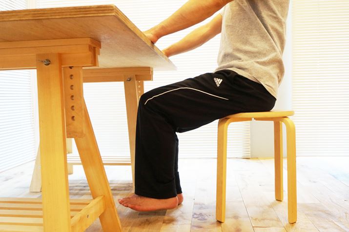 机に手を着いた状態で正しい姿勢を保てるようになったら、今度は両手を身体の横に沿わせてチャレンジ。この状態で背筋を伸ばして足を上下させるのは予想以上にキツイ。ただし、姿勢が崩れるようなら無理せず机に手を置いたスタイルに戻そう。