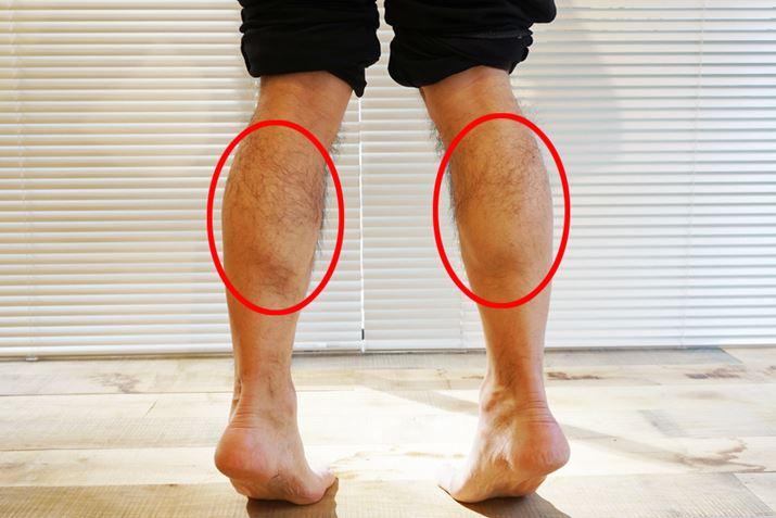 ふくらはぎには腓腹筋とヒラメ筋という筋肉が存在するが、今回の動作で刺激されるのは腓腹筋。腓腹筋はふくらはぎ上部に位置し、アキレス腱の部分からふくらはぎ全体を覆うヒラメ筋に乗っかるように付いている。下部がキュッと細く絞れた形のよいふくらはぎになるには、腓腹筋のトレーニングは不可欠だ。さらに、足に溜まった血液を心臓のほうに押し戻す働きも持っており、「第2の心臓」とも呼ばれている。足がむくみやすい人は、ぜひ鍛えておこう。また、歩く、走る、ジャンプする際に地面を蹴る働きをするのも腓腹筋なので、“キレ”のある動きをいつまでも維持するためにも強化しておきたい。