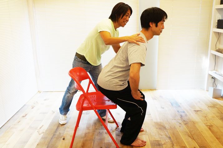 椅子に座る際、お尻が椅子に着く直前でストップし、その状態を3〜5秒程度キープする。何度も繰り返す必要はなく、椅子に座る機会がある時に行うだけでよい。