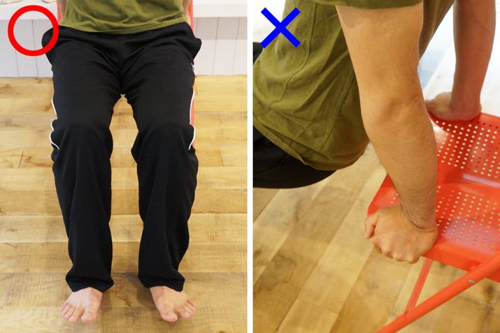 足の裏を床にペタっとつけない以外にも、膝やつま先を外に向けないように注意しましょう。また、手が横に向くように椅子を握ってしまうと腕が曲げにくいので、手は椅子の前側に置くように