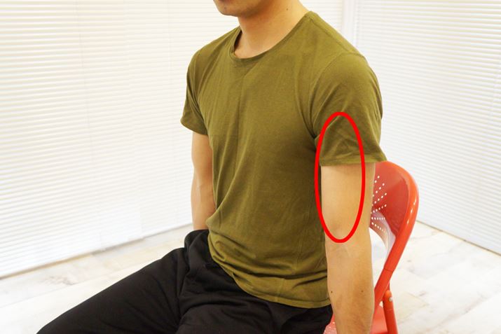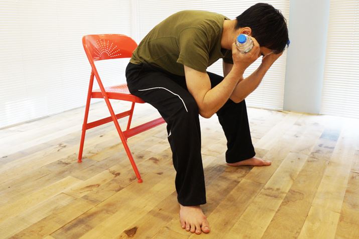 1.両手にそれぞれ液体の入ったペットボトル(500ml)を持ち、椅子に座る。両膝の内側に肘を当て、肘を固定