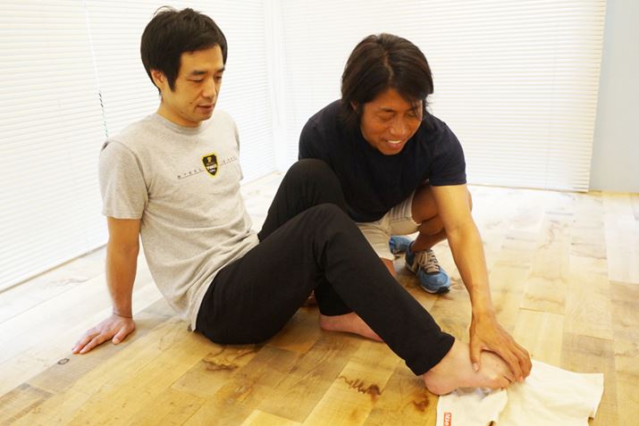 姿勢や歩き方にまつわるトレーニングというと「自分には関係ない」と思われるかもしれませんが、このような普段意識しない筋肉を刺激することは“若々しく動ける”身体を維持するために大切です。足の裏は身体の土台とも言える部分。ペタッと地面についているだけのようでいて、加重の変化にあわせ足裏の働きも変わります。たとえば、スノーボードではブーツで足を固定していますが、滑りがうまい人は足裏を上手に使っているもの。つまり、バランスよい動きには足裏の働きが大きく関係するのです。今回のトレーニングは5本の指すべてを使うことが大切なので、小指もしっかり曲げることを意識してください。