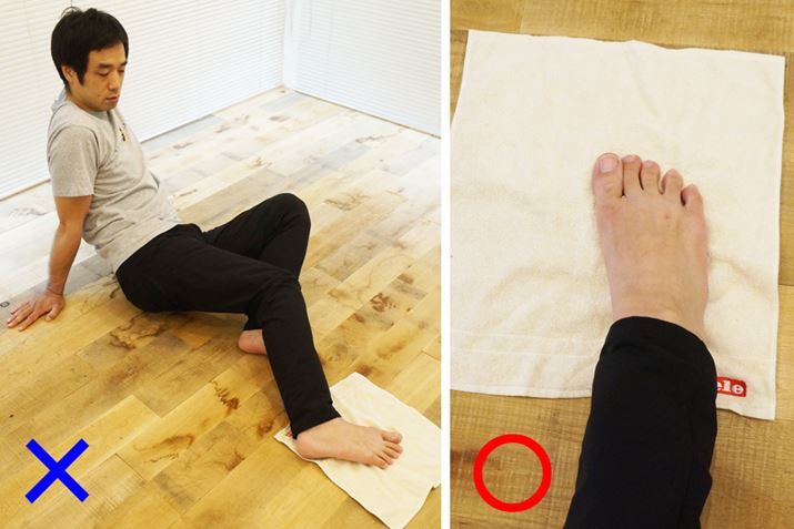 1.タオルを広げて床に置き、その上に片足を乗せる