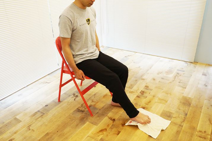 タオルを掴む以前にフォームがうまくできない人は、椅子に座ってトライしてみて!