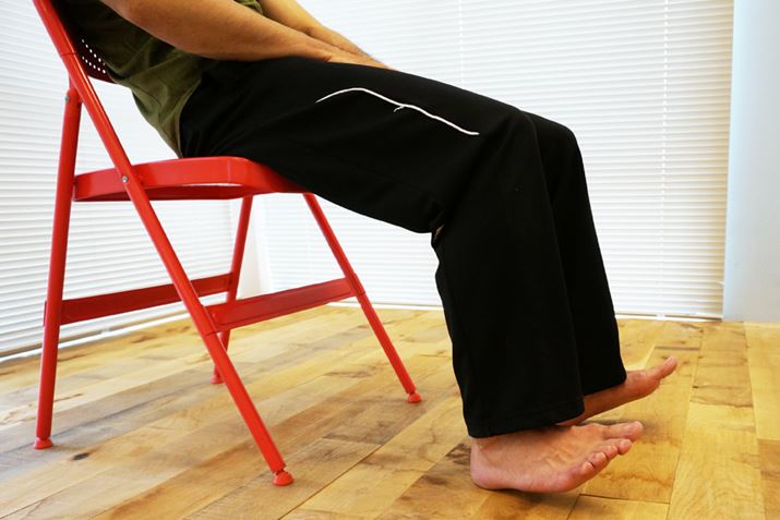 椅子に腰掛けた体勢は同じだが、足のつま先を浮かせるだけでより腹筋に負荷がかかりやすくなる。
