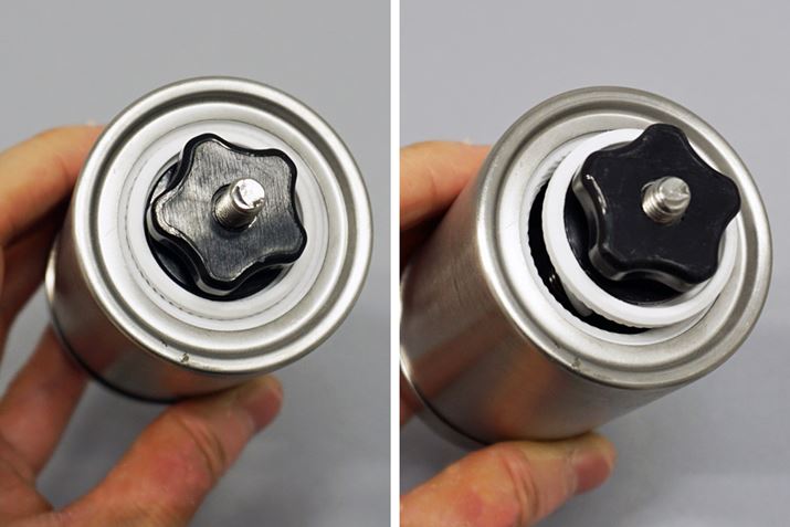 臼と連動して装備されているネジを回すと、開き具合が変動。これにより、粉砕する粗さが調整されます。一般的に細かく挽くほうが濃度は濃くなり、苦味が強くなる傾向