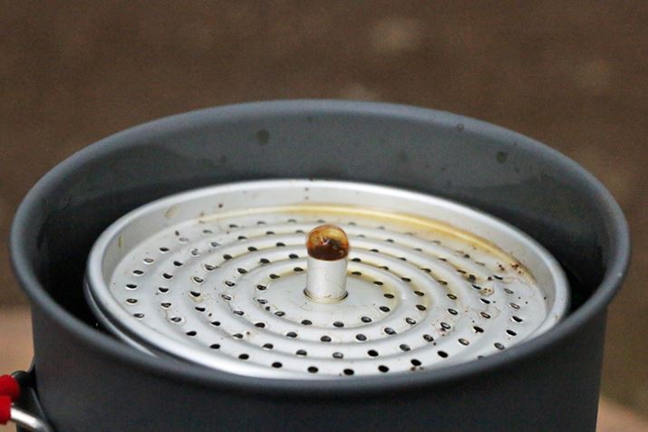 といっても、水を入れてバーナーにセットしただけですが……。ちなみに、フタには穴が開いており、吹きこぼれ防止に役立ちます