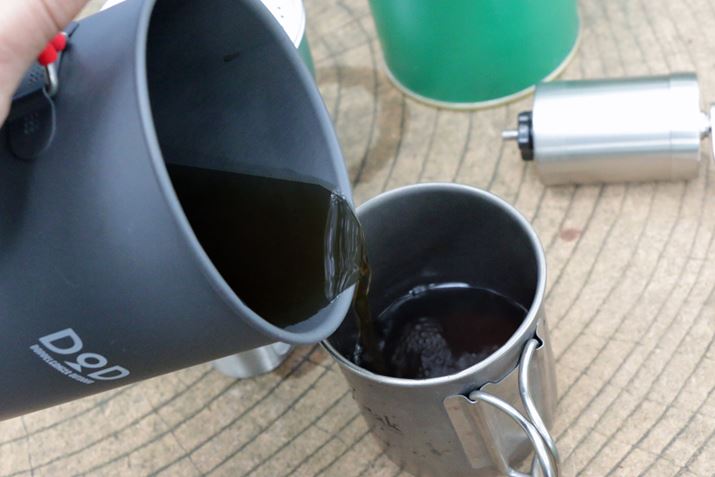 好みの抽出具合で火を止め、ストレーナーを取り出したらコーヒーをいただきましょう。自分が挽いたコーヒーであることと自然の中というシチュエーションが、おいしさをより高めているような気がします