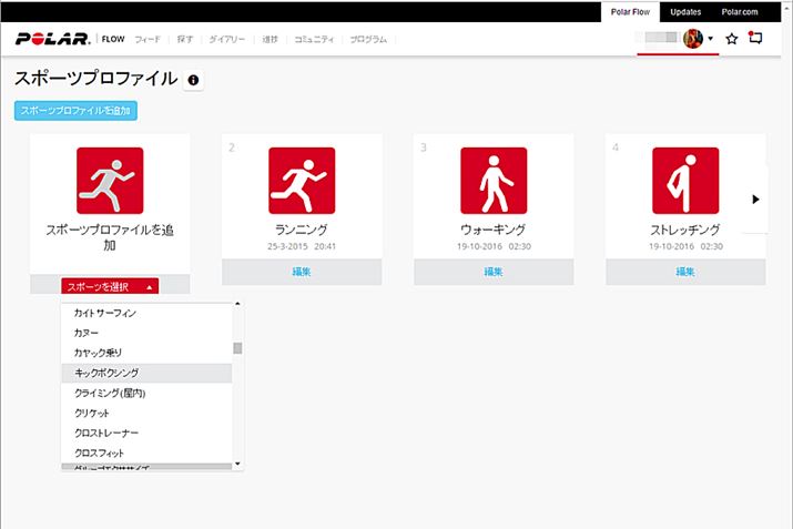 ポラールのクラウドサービス「Polar Flow」との連携は必須。ここで、自分がプレイするスポーツを最大20種類までM600に登録できます。この登録はWebとスマホアプリ両方で編集可能。ウィンドサーフィンやクリケットなど、メジャーではない種目もあります