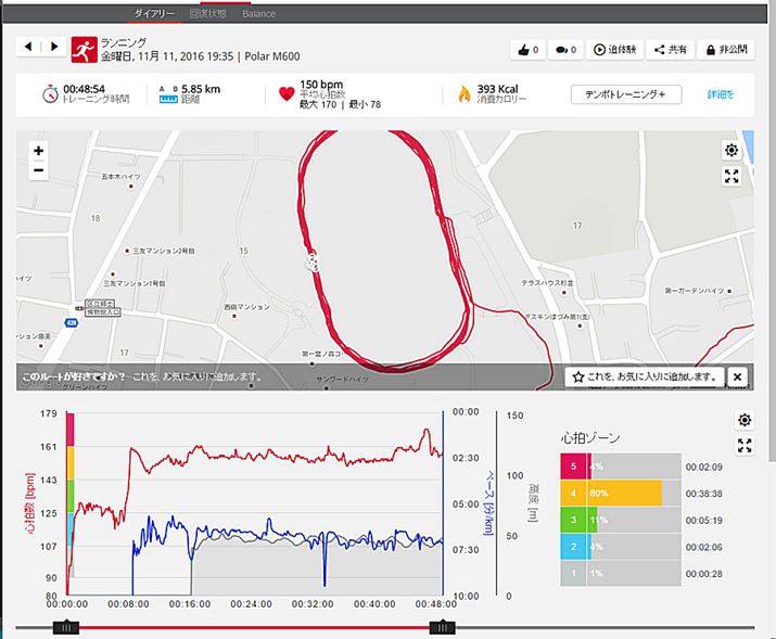 トレーニングの記録は「Polar Flow」であとからじっくりチェック可能。走ったルートやペースはもちろん、心拍数の推移もわかります。こちらもWebとアプリ両方で確認できます