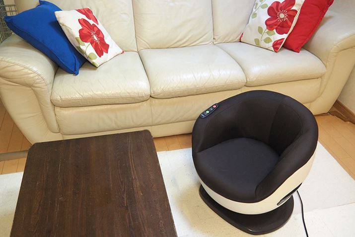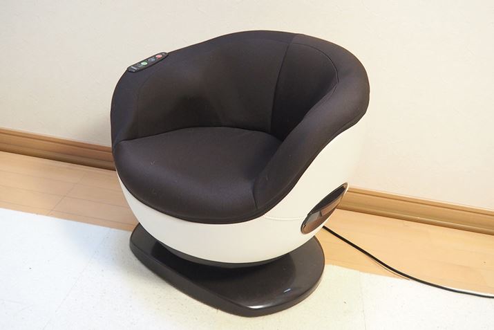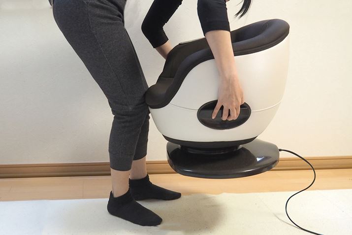 さて、この「FF-100」という製品、一見するとコロンとした椅子のような外観です。見た目はかわいらしいですが、意外にしっかりとした作り。なんと耐荷重は100kgもあります。このため、中肉中背の筆者の夫も安心して使うことができました。ただ、「骨盤ひきしめ」機能(後述)が搭載されているためか、椅子の座面幅は一般的な椅子よりも狭めです。臀部が大きい人にはちょっと窮屈に感じるかもしれません。ちなみに、重さは約11kgありますが、本体左右にハンドルがあるので、そこまで重く感じません。掃除する際の移動もラクラクできました。