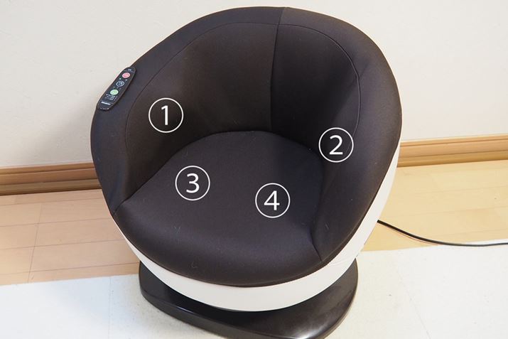 腰の左右(写真1、2)と、座面に2つ(写真3、4)、合計4つのエアーバッグを搭載。腰回りを圧迫することで骨盤を引き締めるそうです