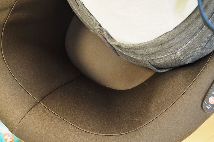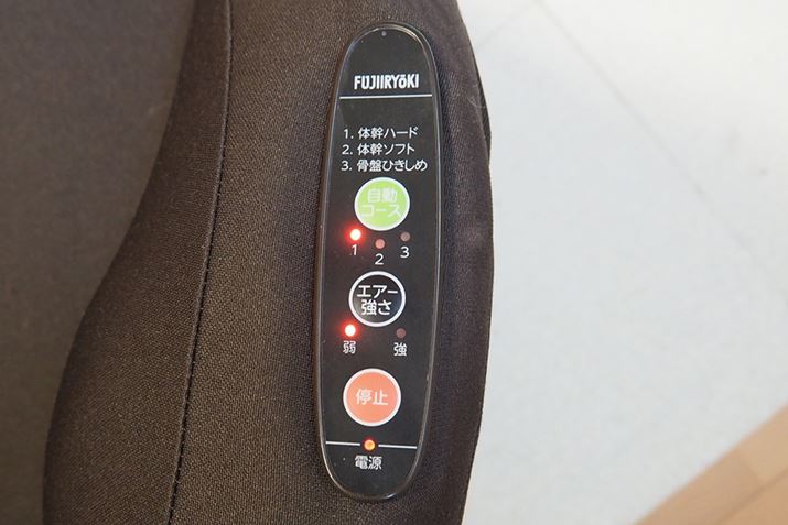 ひじ置きにある操作部は、自動コースとエアーの強さ、そして停止ボタンの3つだけというシンプルな構成。個人的には「あと何分で終わるか」をカウントダウンする表示が欲しかったです