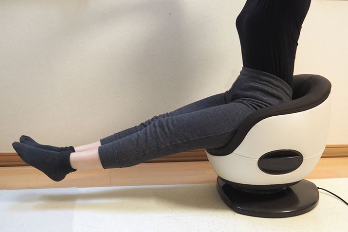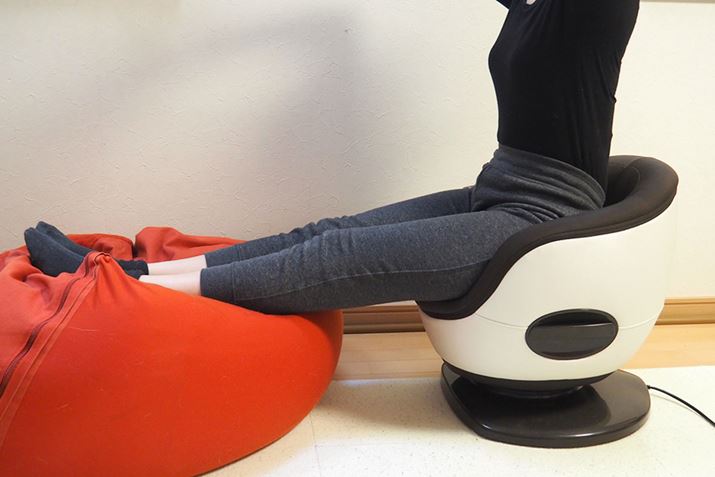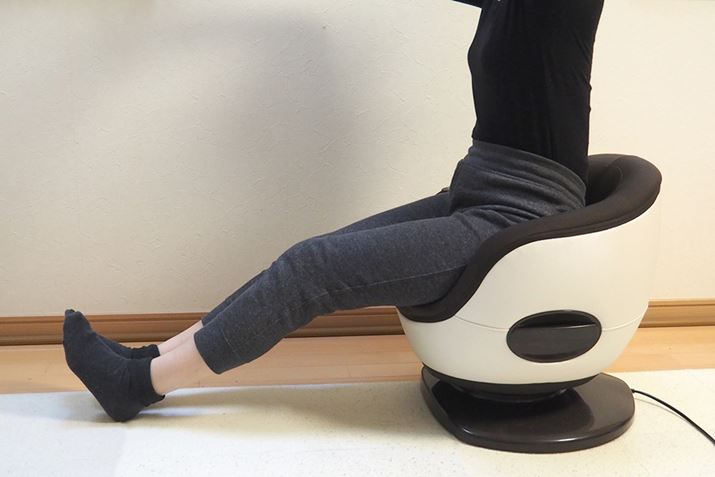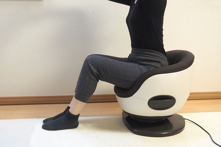 椅子に座るように、膝を曲げて座ると、軽い負荷でラクに使用できます。腰周りがほぐれる感じがあるので、腰痛になりやすい人によさそう。もちろん、腰が痛い時は使ってはいけませんよ