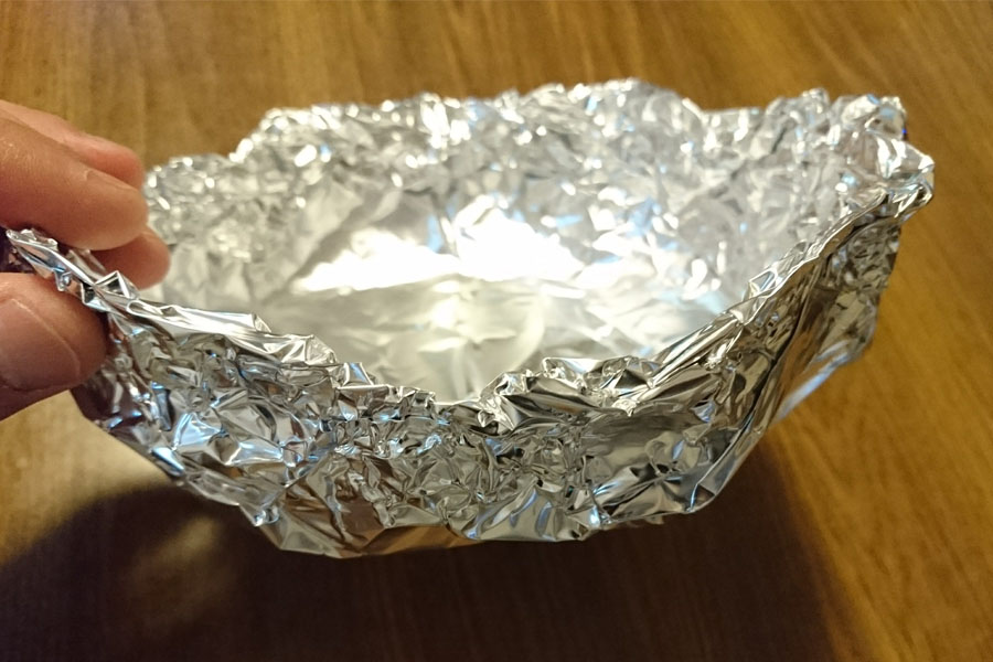 アルミシートが厚いだけあって、カタチを作るのにも力がいりましたが(今回はお皿を型にして成形しました)、なんとか即席の鍋が完成!